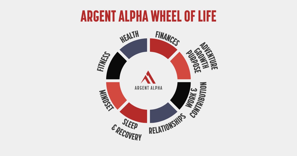 We’ve adapted the framework for the man over 50 who values strength, purpose, and staying power. The Argent Alpha version includes eight spokes that reflect what drives long-term performance: Health, Fitness, Mindset, Sleep & Recovery, Relationships, Work & Contribution, Finances, Adventure/Growth/Purpose.